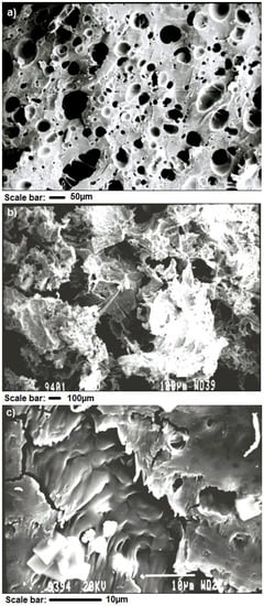 Scanning electron micrographs (Magnification 65×) of compressed: (a) PLGA, (b) HPMC–PLGA, and (c) PEO-PLGA discs following exposure to simulated cerebrospinal fluid (CSF) after 21 days.