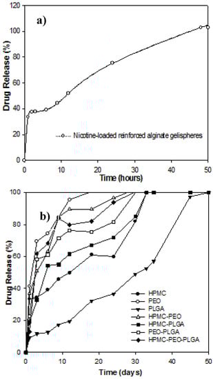 Drug released (%) from: (a) nicotine-loaded reinforced alginate gelispheres, and (b) nicotine-loaded reinforced alginate gelispheres compressed into polymeric discs following exposure to simulated cerebrospinal fluid (CSF) over a period of 50 hours (N = 3; SD < 0.53) and 50 days (N = 3; SD < 0.59%) respectively.