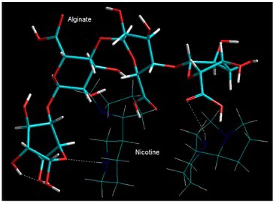 The energy-minimized and geometrically optimized conformation depicting the alginate–nicotine (ALG–NCT) complex is presented in Figure 4. The component binding energies and intrinsic molecular attributes are listed in Equations (5)–(7) and Table 2, respectively. It is evident from Figure 4 that NCT and ALG show close interaction via formation of H-bonds between C–O–C...N–H and C=O...N–H group of ALG and NCT, respectively. The final energy of the drug–polymer complex was stabilized by all three non-bonding interactions (van der Waals interactions, H-bonding and electrostatic interactions) between the constituent molecules ALG and NCT. The surface-to-volume ratio (SVR) of the complex ALG–NCT (SVR = 0.451) displayed lower SVR than the individual molecules (Table 2) further confirming the stability of the complex—the lower the SVR, the more stable the structure. However, the finally globally minimized energy values suggest that the ALG–NCT complex is destabilized by a binding energy of ~4 kcal/mol (Equations (5)–(7)) due to exceptionally high torsional contribution arising due to deviations from optimum dihedral angles (Equation (7)). Such interactions may induce dipoles in the molecular complex due to the torsional strains experienced around dihedral angles.