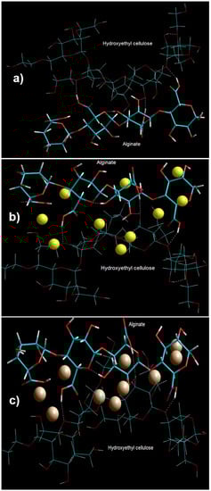 Visualization of geometrical preference of (a) Hydroxyethyl cellulose in complexation with alginate; (b) oligosaccharide–Ca2+ complex, and (c) oligosaccharide–Ba2+ complex derived after molecular mechanics simulations. Color codes: C (cyan), O (red), N (blue), Ca (yellow), Ba (brown), and H (white).