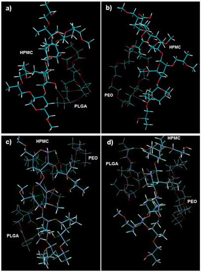 Visualization of geometrical preference of (a) PLGA in complexation with HPMC; (b) PEO in complexation with HPMC; (c) PLGA–HPMC–PEO tripolymeric comples with PEO H-bonded to HPMC; and (d) PLGA–HPMC–PEO tripolymeric complex with PLGA H-bonded to HPMC after molecular mechanics simulations. Color codes: C (cyan), O (red), N (blue), and H (white).