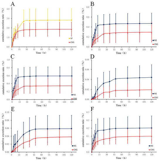 Urinary cumulative excretion profile of (A) HSYA in rats after oral administration of SF and CNS and (B) Ginsenoside Rg1, (C) Ginsenoside R1, (D) Ginsenoside Rd, (E) Ginsenoside Rb1, and (F) Ginsenoside Re in rats after oral administration of NS and CNS (n = 6).