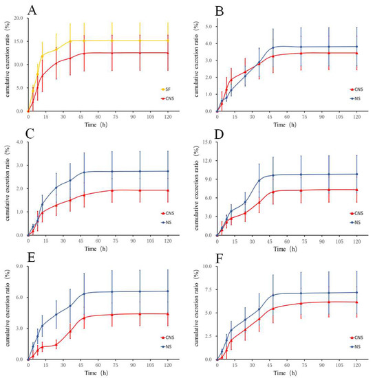 As shown in Figure 2 and Tables S15–S26, after oral administration of SF and CNS to rats, the cumulative excretion ratio of HSYA in the CNS group (12.55%) decreased by 0.83 times compared with the SF group (15.16%). In the meantime, the cumulative excretion ratios of notoginsenoide R1, ginsenoside Rb1, Re, Rd, and Rg1 were 9.82%, 2.74%, 7.19%, 6.59%, and 3.82% within 120 h in the NS group, respectively. In the CNS group, the cumulative excretion ratios of the five constituents were decreased by 0.75, 0.70, 0.86, 0.67 (p < 0.05), and 0.90 times, respectively, compared with the NS group.