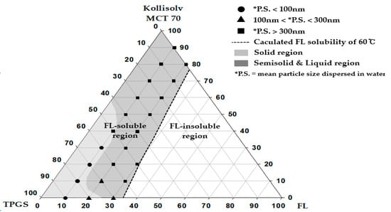 A pseudo-ternary phase diagram was constructed with FL, Kollisolv MCT 70, and TPGS. FL solubility (%) was calculated for the varied composition at the 10% weight ratio interval between Kollisolv MCT 70 and TPGS within the pseudo-ternary phase diagram. Thereafter, the composition of (C, D, E) determined by Equation (1) was plotted (see Figure 1). Equation (1) was used to calculate FL solubility (E, %) with the predetermined C and D.