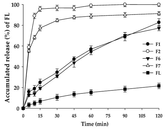 Dissolution profiles of F1, F2, F6, F7, and raw FL in pH 1.2 buffer. Values are represented as means ± SD (n = 3).