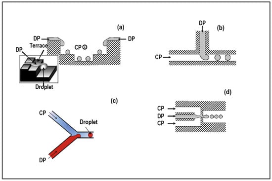Microfluidic devices based on microchannel: (a) Terrace-like device; (b) T-junction device; (c) Y-junction device; and (d) flow-focusing microchannel device (FFD). CP and DP are the continuous and disperse phases, respectively.