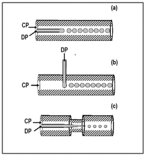 The same theoretic principle is exploited in three capillary-based devices. In this case the disperse phase flows in the very center line of the continuous phase flow (Figure 2), and it never meets the device wall. This is an advantage because the interaction of the disperse phase with the device material is minimized or cancelled. Three capillary-based devices are commonly found: Co-flow capillary device, cross-flow capillary device, and flow-focusing capillary device (Figure 2). In the co-flow device, the disperse phase flows in the same direction as the continuous phase (Figure 2a). The cross-flow device is based on the same principle as the T-junction microchannel device, where the disperse phase flows in a direction perpendicular to that of the continuous phase (Figure 2b). The FFD (Figure 2c) is characterized by having disperse phase flow asymmetrically pinched by the continuous phase flow [].