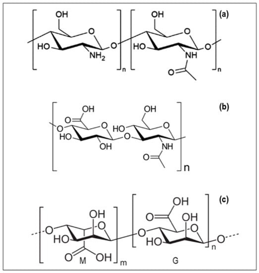 Molecular structures of: (a) Chitosan (CS); (b) hyaluronic acid (HA); and (c) alginic acid (M—mannuronic acid unit, G—guluronic acid unit).