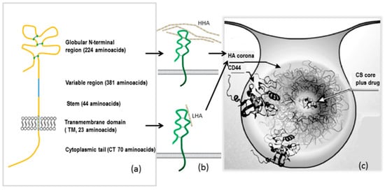 (a) CD44 structure; (b) CD44–HA interaction with high molecular weight HA (HMw HA) or low molecular weight HA (LMw HA); and (c) endocytosis of HA-coated chitosan (CS) nanoparticles (NPs), mediated by interaction with the CD44 receptor, adapted with permission from [,,].