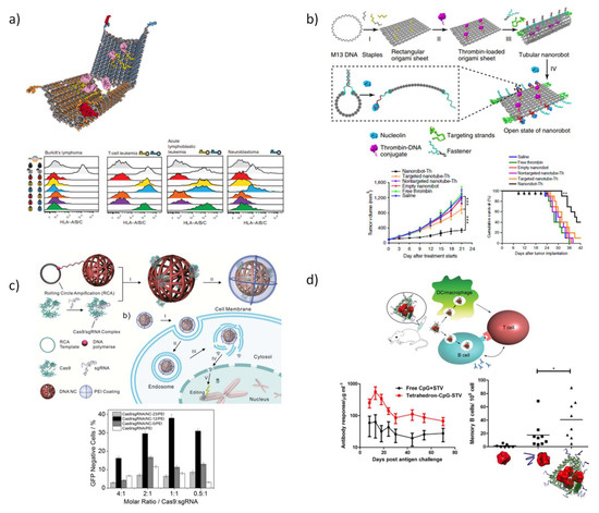 - Li, S.; Jiang, Q.; Liu, S.; Zhang, Y.; Tian, Y.; Song, C.; Wang, J.; Zou, Y.; Anderson, G.J.; Han, J.-Y. A DNA nanorobot functions as a cancer therapeutic in response to a molecular trigger in vivo. Nat. Biotechnol. 2018, 36, 258–264. [Google Scholar] [CrossRef]