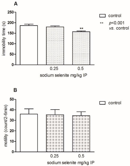 Figure 1. The effect of sodium selenite (at the doses 0.25 and 0.5 mg/kg) on the total duration of immobility in the forced swim test (FST) in mice (A) and on the spontaneous locomotor activity in mice (B). The values represent the mean of immobility time ± SEM (standard error of the mean) in the FST and the movement of mice between the 2nd and 6th min ± SEM in the locomotor activity test. Sodium selenite was injected intraperitoneally (IP) 30 min before the test. ** p < 0.01 vs. control vehicle-treated group (Bonferroni’s test).