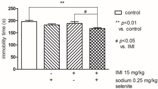 Figure 2. The effects of combined administration of Se and imipramine (IMI) on the immobility time in the FST in mice. The values represent the mean ± SEM. Sodium selenite was injected IP 30 min before the test. ** p < 0.01 vs. control vehicle-treated group, # p < 0.05 vs. IMI (Bonferroni’s test).