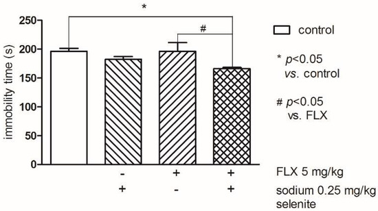 Figure 3. The effects of combined administration of Se and fluoxetine (FLX) on the total duration of immobility in the FST in mice. The values represent the mean ± SEM. Sodium selenite was injected IP 30 min before the test. * p < 0.05 vs. control vehicle-treated group, # p < 0.05 vs. FLX (Bonferroni’s test).