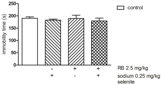 The results depicted in Figure 4 show that both Se at the dose 0.25 mg/kg and RB at the threshold dose 2.5 mg/kg administered alone as well as after concomitant treatment had no effect on the immobility time in mice (two-way ANOVA: groups (control and sodium selenite) F(1,35) = 3.86; p = 0.0574; pretreatment (control and RB) F(1,35) = 1.46; p = 0.2360; groups x pretreatment F(1,35) = 1.54; p = 0.2226) (Figure 4).