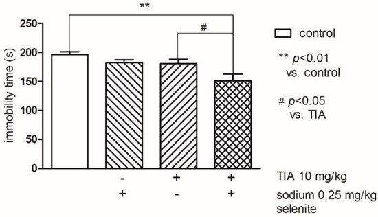 Figure 5. The effects of combined administration of Se and tianeptine (TIA) on the total duration of immobility in the FST in mice. The values represent the mean ± SEM. Sodium selenite was injected IP 30 min before the test. ** p < 0.001 vs. control vehicle-treated group, # p < 0.05 vs. TIA (Bonferroni’s test).