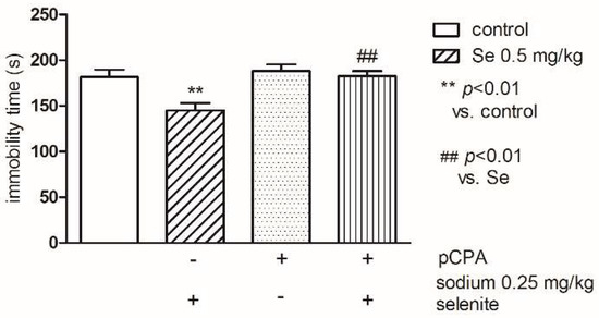 Figure 6. The effects of pretreatment with p-chlorophenylalanine (pCPA) on the antidepressant-like effect of sodium selenite in the FST in mice. The values represent the mean ± SEM. pCPA was injected at dose of 100 mg/kg for four consecutive days. Sodium selenite was injected IP 30 min before the test. ** p < 0.001 vs. control vehicle-treated group, ## p < 0.01 vs. pCPA (Bonferroni’s test).