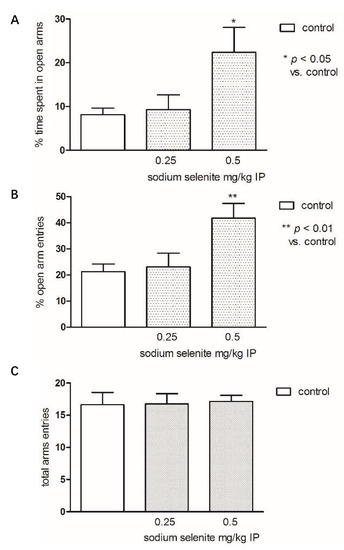 Figure 7. The effects of sodium selenite (at the doses 0.25 and 0.5 mg/kg) on the percentage of time spent in open arms: (A) percentage of open arm entries and (B) total number of arm entries (C) in the elevated plus-maze (EPM) procedure. Sodium selenite was administered IP 30 min before the test. Data are expressed as mean ± SEM values. ** p < 0.01; * p < 0.05 vs. control vehicle-treated group (Bonferroni’s test).