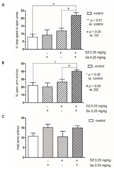 Figure 8. The effects of combined administration of Se and diazepam (DZ) on the percentage of time spent in open arms (A), percentage of open arm entries (B), and total number of arm entries (C) in an EPM procedure. DZ was injected subcutaneously (SC) 60 min and sodium selenite IP 30 min before the test. Data are expressed as mean ± SEM values. ** p < 0.01; * p < 0.05 vs. control vehicle-treated group, # p < 0.05 vs. DZ group (Bonferroni’s test).
