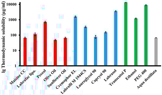 Thermodynamic solubility of baicalin in various oils (red), emulgents (blue), co-emulgents (green), and distilled water (gray). (Mean ± SD; n = 3).