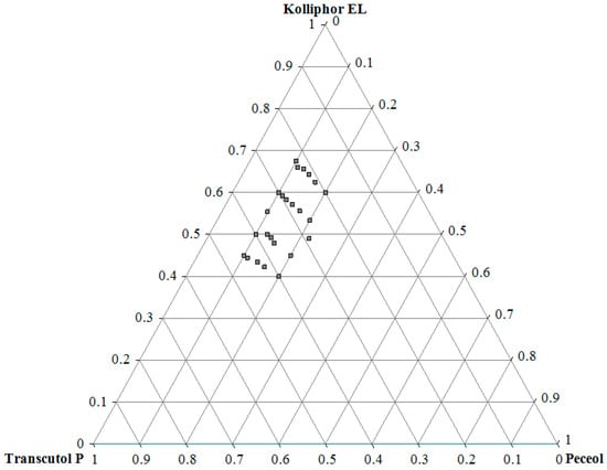 Ternary phase diagram of Peceol®, Kolliphor® EL, and Transcutol® P based on droplet size and transmittance analysis. The area bordered by grey squares represents the self-nanoemulsifying region. (n = 3).