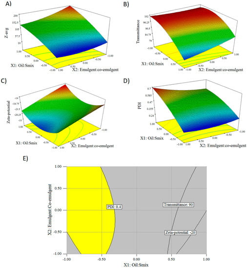 3D response surface plots for effect of oil:Smix ratio (X1) and emulgent:co-emulgent ratio (X2) on Z-avg (A), Transmittance (B), Zeta-potential (C), and PDI (D). Overlay plot (E) for various oil:Smix and emulgent:co-emulgent ratios, where the area that satisfies the constraints is yellow, while the area that does not meet criteria is grey.