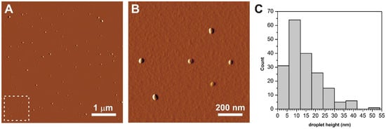 (A) Atomic force microscopy (AFM) amplitude-contrast images of surface adsorbed lyophilized oil droplets. (B) The area marked by dashed line is shown. (C) Height distribution of droplets (n = 122).