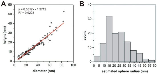(A) Correlation between the height and diameter of surface-adsorbed oil droplets. (B) Histogram of estimated radius of oil droplets in the fluid phase. Estimation based on volume of surface-absorbed droplets (n = 122).