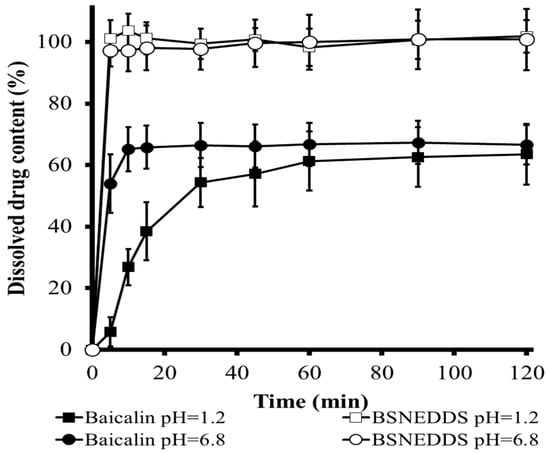 In vitro dissolution profiles of BSNEDDS pre-concentrate and baicalin in pH = 1.2 and pH = 6.8 dissolution media are depicted in Figure 7. It was observed that baicalin loaded nanodroplets were rapidly dispersed in the media (within 5 min) irrespective of pH of the dissolution media, and 100% of baicalin was dissolved in nanodroplets. In contrast, the pure drug showed much lower dissolution rates for the initial period of 5 min at both pH values. It was proved that the dissolution rate of baicalin is significantly lower in the case of pH 1.2 correlated to pH 6.8, which can be explained by its pH-dependent solubility.