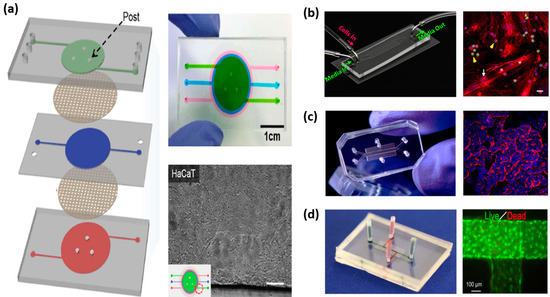 Examples of immune organs-on chip. (a) skin-on-chip consisting of three PDMS layers and two porous membranes filled with fluid three different colors or containing HaCaT cells [39], (b) bone marrow-on-chip consisting of 4 microchannels and containing SUP-B15 and bone marrow derived stem cell co-culture [40], (c) gut-on-chip consisting of two hollow microchannels separated by a porous membrane containing villus epithelium [41] and (d) lymphatic vessel-on-chip with a specific microchannel pattern containing blood vascular endothelial cells and lymphatic endothelial cells [42].