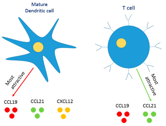 Response of different immune cells to chemokine gradients. Based on the work by [97,98], mature dendritic cells are much more attracted to the chemokine CCL19 than they are to the chemokines CCL21 or CXCL12. Interestingly, under physiological gradient.