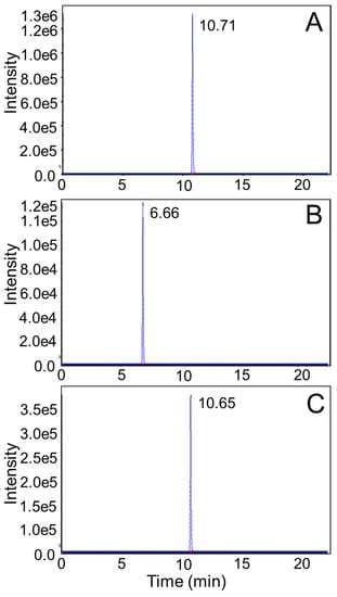 Analytical separation and quantitation of flupirtine (m/z 305.1 → m/z 196.1), flupirtine-d4 (m/z 309.1 → m/z 196.1), and D-13223 (m/z 275.2 → m/z 166.1) were achieved on an Agilent Eclipse PLUS-C18 column (4.6 × 150 mm, 5 µm) (Agilent Technologies, Santa Clara, CA, USA). The column was held at 40 °C and eluted at 1 mL/min with a gradient of 0.1% formic acid in water (A) and 0.1% formic acid in acetonitrile (B). Chromatographic separation was achieved with a linear gradient (time, % of solvent B): 0–12 min, 10%–30% B; 12–13 min, 30%–10% B; then isocratic for 9 min at 10% B to re-equilibrate the column. Limited validation of the method was performed. The lower limit of quantitation (LLOQ) for flupirtine using flupirtine-d4 internal standard was at least 5 fmol (accuracy = 100.5%, relative standard deviation (RSD) = 1.3%; 0.42 ng/mL of flupirtine maleate; N = 4) and for D-13223 using the flupirtine-d4 internal standard, the LLOQ was 0.5 fmol (accuracy = 98.4%, RSD = 2.2%, 0.031 ng/mL of D-13223 HCl; N = 4).