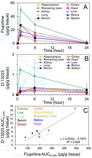 AUC0–24h of D-13223 correlated well with AUC0–24h of flupirtine when all tissues were plotted, with a correlation coefficient (R2) of 0.84 (Figure 2C). Further, correlations between flupirtine and D-13223 concentrations at multiple time-points indicated R2 of 0.49 and 0.68 for liver and lung, respectively, with other tissues showing even lower correlation.