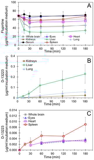 Figure 3 shows the time-course of flupirtine and D-13223 concentrations in the incubation medium. Flupirtine remained quantifiable in the incubation medium throughout the 3-h experiment for all the samples (Figure 3A). Flupirtine concentrations at 30 min were the highest for the serum and the lowest for the liver. After the initial rapid decline by 30 min, flupirtine concentrations remained relatively stable in the incubation medium for all the tissues. The drug loss was the highest in the incubation medium for the liver and the lowest for the serum, eyes, and spleen.
