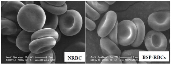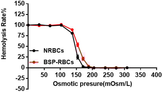The osmotic fragility test was used to detect structural changes in RBC membranes subjected to osmotic stress. The fragile cells maybe destroyed and eliminated quickly from circulation by macrophages [,]. As the hemolysis rate curve displayed in Figure 3, BSP-RBCs were easier to hemolysis under pressure of 103 to 205 mOsm/L, the ability of BSP-RBCs to resist osmotic pressure decreased. It suggested that drug loading made cells more fragile, which was in agreement with those of GI Harisa et al. who have found that osmotic fragility of loaded cells is higher than unloaded cells []. And this may be due to multiple changes in cell morphology during drug loading process and subsequent several washing steps. Although there was small decrease of osmotic fragility after loading process, the OFIs of BSP-RBCs (148 mOsm/L) and NRBCs (173 mOsm/L) were very close, the gap between them was much less than what have been reported by Hamidi et al. [].