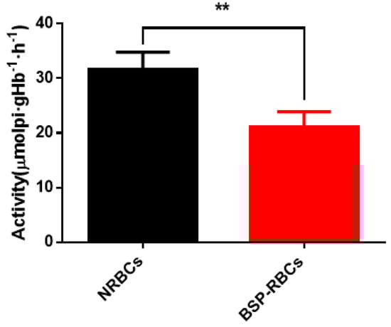 Na+/K+-ATPase activity on membrane of NRBCs and BSP-RBCs. Data are represented as mean ± SD, three samples were used in each group. ** correspond to p < 0.01.