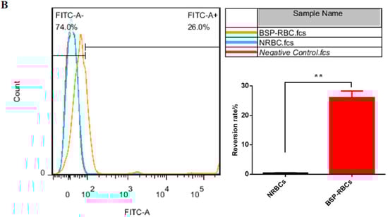 PS surface exposure of NRBCs and BSP-RBCs. (A) FSC-SSC scatter plot; (B) PS reversion rate. Data are represented as mean ± SD, three samples were used in each group. ** correspond to p < 0.01.