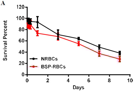 The stretched time scale for the first 24 h in Figure 6B permitted to observe more clearly how the BSP-RBCs were removed from circulation faster than NRBCs. These findings agreed well with the vitro results shown in Figure 4 and Figure 5 that more damaged cells existing in BSP-RBC preparations. As can be also seen in Figure 6B, only 26.3 ± 4.27% of loaded cells were cleared from circulation after 24 h, which showed better survival ability than what was reported by Carmen et al. []. In the later days, BSP-RBCs showed similar clearance rate to NRBCs, about 15% of injected cells one day. In addition, the survival rate of BSP-RBCs was still about 27.8 ± 1.5% on day 9 which suggested the long- circulation potential of RBC.