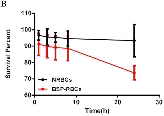 In vivo survival of NRBC and BSP-RBC. (A) Survival in 9 days; (B) Survival in the first 24 h. Data are represented as mean ± SD, three samples were used in each group.