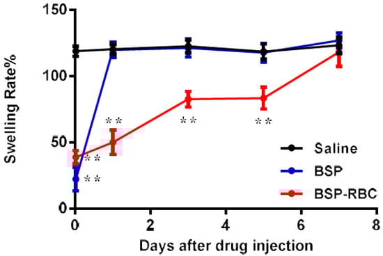 The anti-inflammatory effect of BSP-RBCs was evaluated by using mice ear edema model. The mice (20 g) were injected intravenously firstly with BSP-RBCs (500 μg/mL, 0.1 mL). Then, at 30 min after drug injection, xylene was painted on the right ear of mice (30 μL/ear) to cause ear inflammation. After 30 min, six mice were selected and sacrificed in each group and their ears were punched (8 mm) and weighted. The same model and measurements were repeated on days 1, 3, 5, and 7 after drug injection. The differences between the weights of two ears represents the degree of inflammation, and the smaller difference means better anti-inflammatory effect.