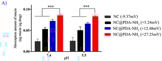 Interaction between NC@PDA-NH2 and mucin. (A) Adsorption of mucin by NC@PDA-NH2 with different surface charges or NC (n = 3, mean ± SD). (B) Change in size distribution of NC@PDA-NH2 (or NC) after mixing with mucin. *** indicates p < 0.001.