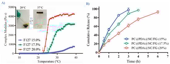 Consistent with previous reports on FG [33], the phase transition temperature and in vitro drug release rate of NC@PDA-NH2-containing FG (NC@PDA-NH2/FG) were both dependent on the concentration of Pluronic F127 (Figure 4). A concentration of 17.5% (w/w) was selected for Pluronic F127 to assure easy administration and moderate dispersion into vaginal fluid.