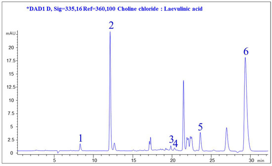 As shown in Figure 1, the extracted compounds with a wide range of polarity were well separated and covered most of the practical HPLC elution range. Since the interference was caused by background, minor compounds, and other co-elutes ingredients, six peaks were chosen for subsequent comparison of the extraction efficiency of different solvents. Among these chromatographic peaks (Figure 1), the compounds were identified by comparing the retention time with that of standard references, which represented major different groups of anti-diabetic ingredients within a wide polarity range in JQJT extract. Consequently, the above-mentioned reference was selected to evaluate the extraction efficiency of different NADESs.
