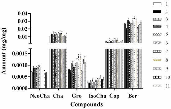 The HPLC-UV method was used for quantitative determination of the phenolic acid and alkaloids in various solvent extracts. Results showed that the extraction yields (mg/g) of the compounds obtained from different tested solvents varied considerably (Figure 2). The yield of these components in water and methanol was closely related to their polarity, which was indicated by the elution order in HPLC analysis. The 70% methanol extracts gave a higher dissolving capacity of less polar compounds berberine and coptisine, while water was more suitable for extraction of relative polar compounds. All the investigated NADESs exhibited high extraction efficient for most of the target compounds (Figure 2), which was consistent with previous reports that the extraction efficiency of NADESs for phenolic acids was superior to that of methanol [16,26]. No significant differences were observed in the extraction efficiency of NADESs and water for neochlorogenic acid and chlorogenic acid. Duan et al. [17] showed that natural-occurring alkaloids could be highly extractable in laevulinic acid-based NADESs. Similarly, when using laevulinic acid-based NADESs (ChCl-La and Pro-La), the yields of alkaloids, including coptisine, groenlandicine, and berberine were significantly increased.