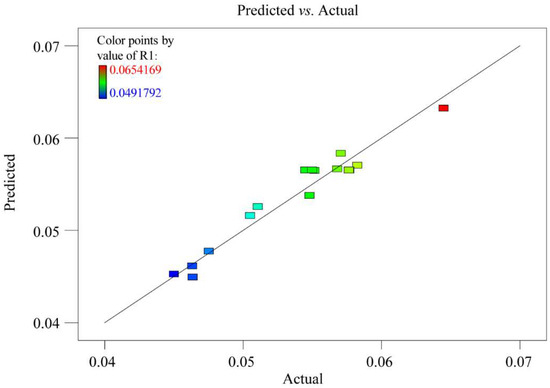The square of the correlation coefficient (R2) and the lack-of-fit was employed to evaluate the model quality. The value of R2 in this model was 0.95, which suggested that the experiment values corresponded well with the predicted yields. The measured F value of 1.71 and p value of 0.30 for lack-of-fit were not significant, indicating the obtained model could perfectly explain all data. In addition, the variation (CV) with a relatively low value of 2.41 indicated a very low degree of deviation and a good deal of reliability of the experimental values. The model satisfactoriness was further judged by diagnostic plots. The predicted versus actual values plots of the extraction yield was presented in Figure 3. The plot indicated an adequate agreement between the predicted values obtained from the models and the observed ones. The p value was used to determine the significance of each coefficient. As observed in Table 3, the obtained model was significant with very small p value (p = 0.001), which demonstrated that this model could be utilized to evaluate the independent variables and their relationship.