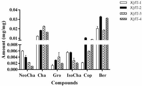 The established HPLC-UV method was applied for quality evaluation of JQJT preparations through simultaneous quantitative determination of six selected bioactive compounds. The JQJT preparations were extracted by using the newly proposed NADESs-based UAE method. The quantitative analytical results of JQJT samples shown in Figure 5 indicated that the concentration of each compound present in individual preparations varied greatly, and the content of each analyte in different preparations was also different.