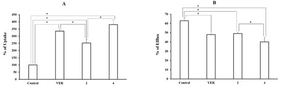 In the present study, compounds 1–4 (Figure 1) were selected to examine their effect on DNM cytotoxicity in MCF-7/ADR cells. These selected compounds were not toxic to the P-gp overexpressing cells at five different concentrations (5, 10, 25, 50, and 100 μM) (Table S1). Previously, we examined P-gp inhibitory effect of a positive control, VER at two different concentrations (50 and 100 uM) in in vitro studies. Because VER at the concentration of 50 uM did not fully inhibit P-gp function, as compared to 100 uM concentration, based on the results of cytotoxicity and uptake studies [9,27], the cells were treated with 100 uM of the piperazine derivatives and VER to investigate their P-gp inhibitory activity in this study. Among the four piperazine derivatives, the chemical structures of compounds 2–4 were similar (Figure 1). Based on chemical structure and reversing effect on resistance to DNM by decreasing IC50 value in the cells, compounds 2 and 4 were chosen to examine their effects on uptake and efflux functions of P-gp substrate and P-gp ATPase activity.