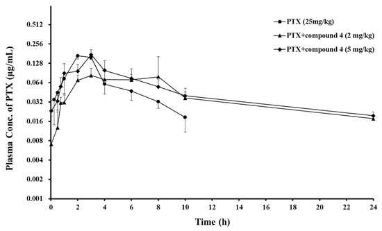 For intravenous injection of 2 mg/kg of PTX (IV) and oral administration of 25 mg/kg of PTX (PO) with 0, 2, or 5 mg/kg of compound 4, the rats were divided into 4 groups on the day. The common carotid artery was catheterized for blood sampling. Blood sampling was conducted at 0, 0.033, 0.083, 0.25, 0.5, 1, 2, 3, 4, 6, 10, and 24 h for the IV group and 0, 0.25, 0.5, 1, 2, 3, 4, 6, 8, 10, and 24 h for PO groups [21,23].