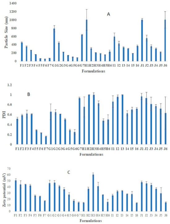 Represent effect of increasing the CS and TPP concentration, TPP volume on Particle size (A), PDI (B), and zeta potential (C). Represent optimization of placebo chitosan (CS) nanoparticles (NPs) using different concentration of CS and TPP (% w/v), different CS:TPP ratio. There were a total 32 formulations run for optimization purposes. Formulation code F represents 0.05% CS and TPP (% W/V), G represents 0.1% CS and TPP (% W/V), H represents 0.15% CS and TPP (% W/V), I represents 0.175% CS and TPP (% W/V), and J represents 0.2% CS and TPP (% W/V). Sub-codings F1, G1, H1, I1, and J1 (1 mL TPP, CS: TPP ratio 10:1), Sub-codings F2, G2, H2, I2, and J2 (2 mL TPP, CS: TPP ratio 5:1), Sub-codings F3, G3, H3, I3, and J3 (3 mL TPP, CS: TPP ratio 3:1), Sub-codings F4, G4, H4, I4, and J4 (4 mL TPP, CS: TPP ratio 2.5:1), Sub-codings F5, G5, H5, I5, and J5 (5 mL TPP, CS: TPP ratio 2:1), Sub-codings F6, G6, H6, I6, and J6 (6 mL TPP, CS: TPP ratio 1.67:1), Sub-codings F7 and G7 (7 mL TPP, CS: TPP ratio 1.43:1).