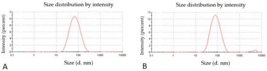Photon correlation spectroscopy (PCS) images of (A) placebo chitosan nanoparticles and (B) rotigotine-loaded chitosan nanoparticles.
