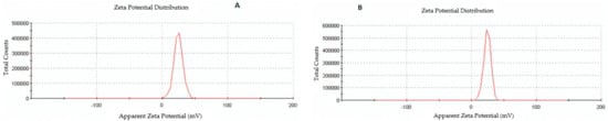 Zeta potential images of (A) placebo chitosan nanoparticles and (B) rotigotine-loaded chitosan nanoparticles.